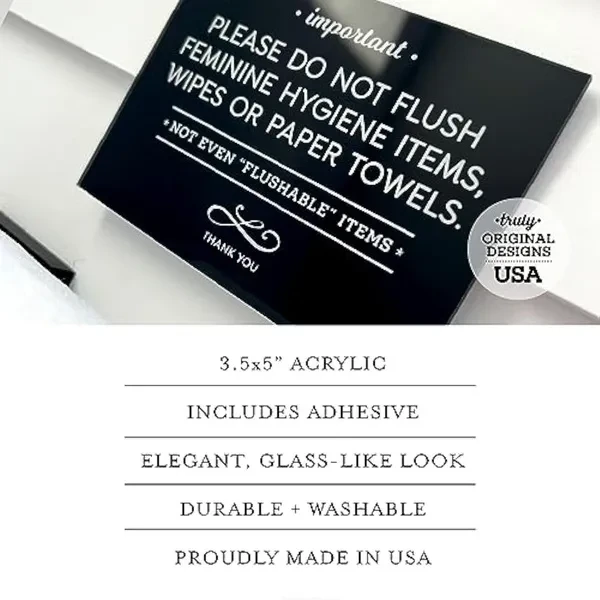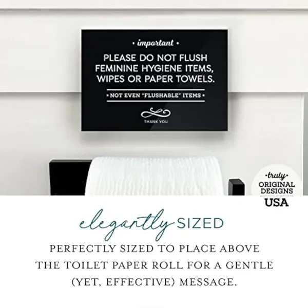 Reilly Originals 3.5x5 Inch Do Not Flush Feminine Hygiene Items, Wipes, Paper Towels Designer Bathroom Sign ~ Ready to Stick or Lean ~ Premium Finish, Durable (2)