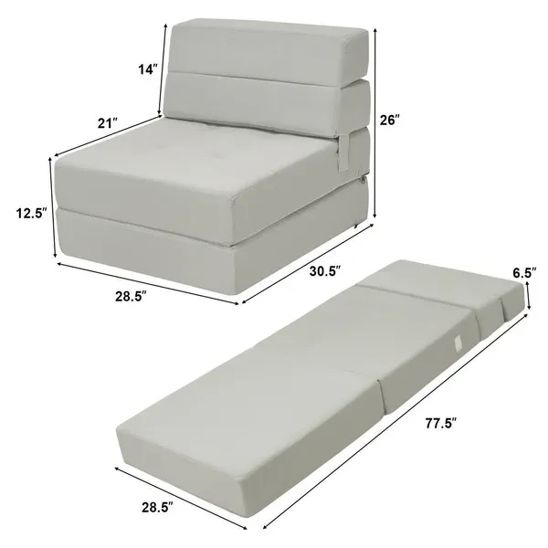 Note:Shipping Exclude these locations: Africa, Asia, Central America and Caribbean, Europe, Middle East, North America, Oceania, Southeast Asia, South America, Alaska/Hawaii/Puerto Rico, US Protectorates, APO/FPO, PO Box This is our brand new tri-fold sofa bed which has a flocking surface and is filled with superior sponges to achieve a more comfortable sitting. Thanks to its innovative quarter-fold design, you can unfold it when you need. Besides a bed, it can also be used as a laid-back lounge or a cozy sofa. In addition, our sofa bed features fixed magic sticks on the two side of the cushion to enhance security when the sofa is used. It is suitable for apartment dwellers, college dorms, family dens and doesn't take up much space. Come and buy it now! You won’t be disappointed! Feature: Brand new and high quality Innovative tri-fold design, easy to storage Flocking surface & sponge filling, more soft and comfortable Used as a comfortable sofa, a laid-back lounge or a cozy bed Great for apartment dwellers, college dorms, family dens, etc Suitable for video gaming, reading a book, watching movie, sleeping,etc With fixed magic stick to enhance security Removable cover for convenient cleaning Specification: Main material: flocked cloth, sponge, polyester wadding Sofa dimension: 28.5”×30.5”×26”(W×D×H) Bed dimension: 77.5”×28.5”×6.5”(L×W×H) Net weight: about 21 lbs Package includes: 1×Sofa Bed 1×instruction