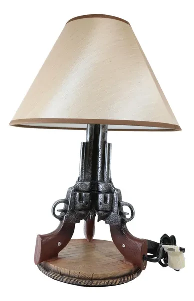 • This Western Triple Six Shooters Revolver Gun Table Lamp comes with the fabric shade as pictured. Made of polyresin, hand painted and polished, the quality finish is superb! • This overall Western Triple Six Shooters Revolver Gun Table Lamp measures about 20" tall. The shade is 8" tall and 13" in widest diameter. Fully assembled, the lamp weighs slightly over 4 lbs. • The 3 revolvers lamp body measures 14.5" tall and 9" in wide and 8.25" deep approximately. Because all our products are individually hand painted work of art, the color tone may vary from the pictures. Use only Type A light bulb (not included), Max 40 watt. Approx. 4 1/2 ft. UL Approved electric cord with a rocker on/off switch. • This western decoration is always a sensation for cowboys or lovers of the wild west. This decorative desktop or table lamp adds a well lit frontier touch to any room decorated with Western or Southwest themed home accents. Featuring well detailed 3 revolver guns pointing up toward the sky supported by a round faux wood plank base. This lamp will illuminate your room with Western Charm! • This is an Ebros exclusive collection. Accessories and Decor pieces in pictures are not included with the listing; only the shade and the revolver lamp base is sold in the this listing.