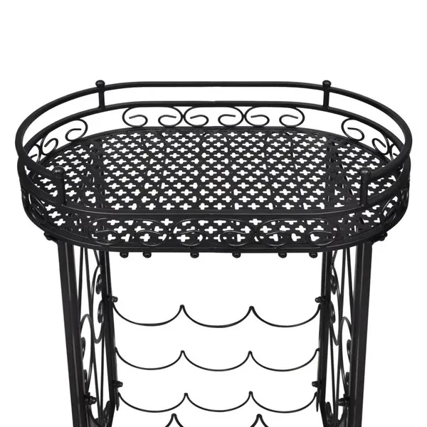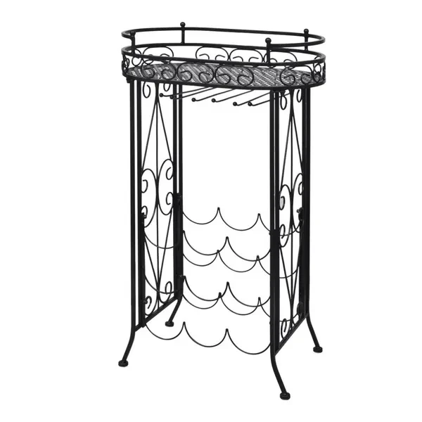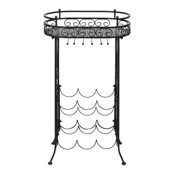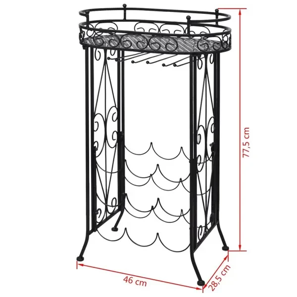 This floor standing wine rack is a real eye-catcher wherever it goes. Made of wrought iron, this wine rack is fully powder coated to be rust free and will last for generations! This wine rack has 9 positions to hold bottles. Coming with a railed plate, It is also served as a table. Several hooks beneath the table plate make it possible for you to hang wine glasses. Therefore, this wine rack will surely be a perfect addition near your dining table. Its classic and elegant style brings people romantic feelings. It will also be a great gift for your friends and acquaintances who are wine lovers. Bring this chic wine rack home and enjoy your life with it! Material: Wrought iron Powder coated in black Total size: 46 x 28.5 x 77.5 cm (W x D x H) Weight: 3.3 kg Capable of holding 9 bottles or more Hooks included for hanging wine glasses