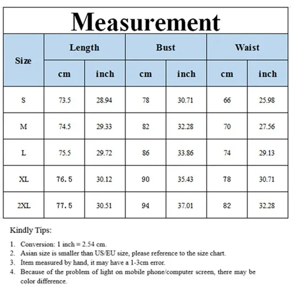 Hello!Welcome to our store! Package Include: 1x Dress Color: white,black,pink,sky blue Material:Polyester fiber (polyester) Attention: This is Asian size usually will get One size smaller than US size. please choose larger and check carefully before order "Size:S,M,L,XL,2XL Size S: Length 73.5cm, Bust 78cm ,Waist 66cm M: Length 74.5cmBust , 82cm ,Waist70cm L: Length 75.5cm, Bust 86cm,Waist 74cm XL: Length 76.5cm,Bust 90cm, Waist78cm 2XL: Length 77.5cm,Bust 94cm ,Waist82cm" 1inch=2.54cm There are 2-3% difference according to manual measurement. Please check the measurement chart carefully before you buy the item.