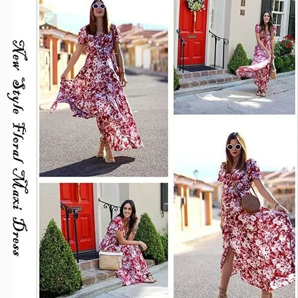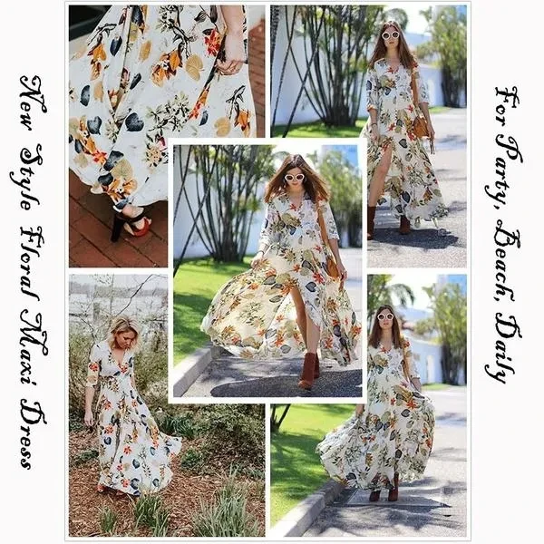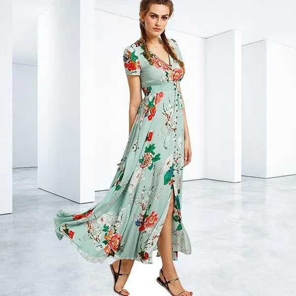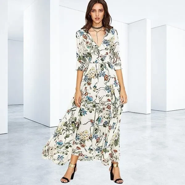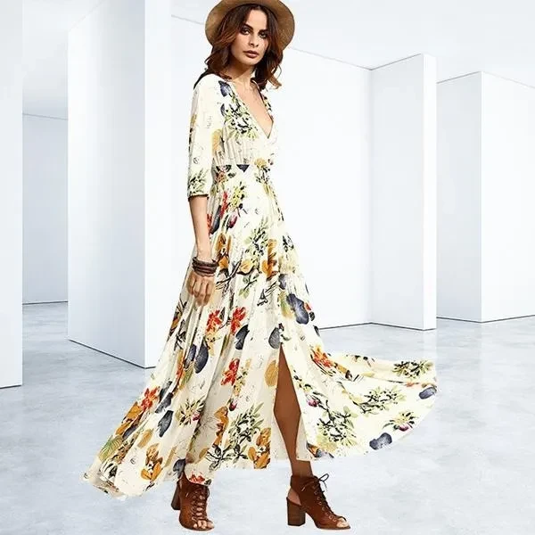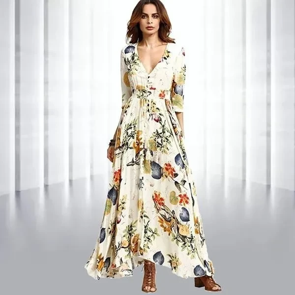 Womens Fashion Bohemian V Neck Print Big Swing Long Dress Plus Size