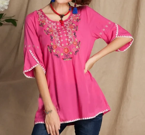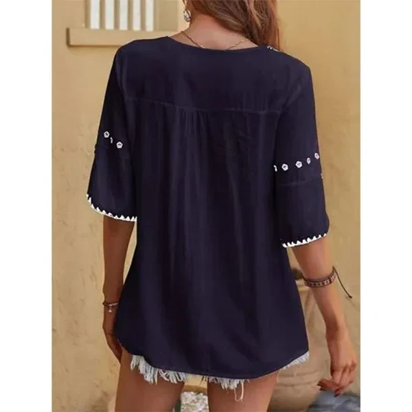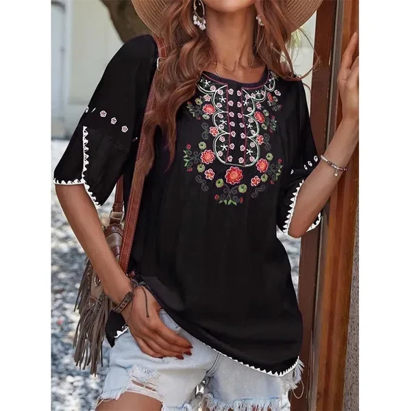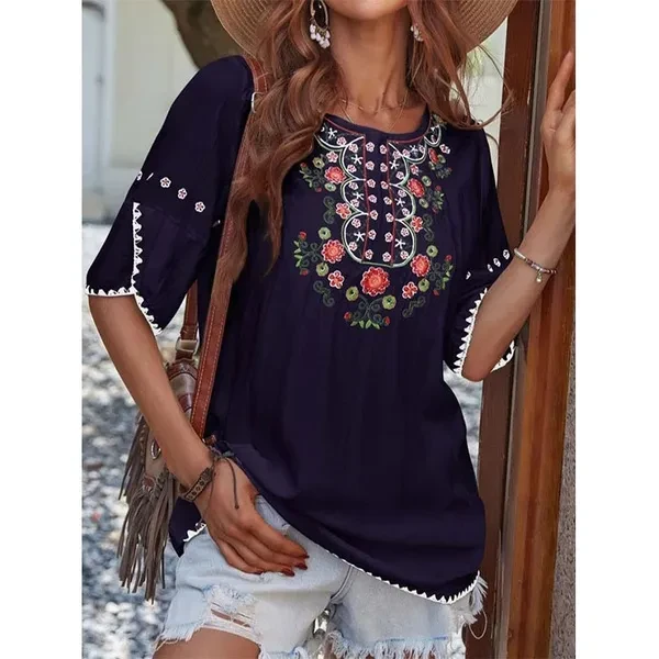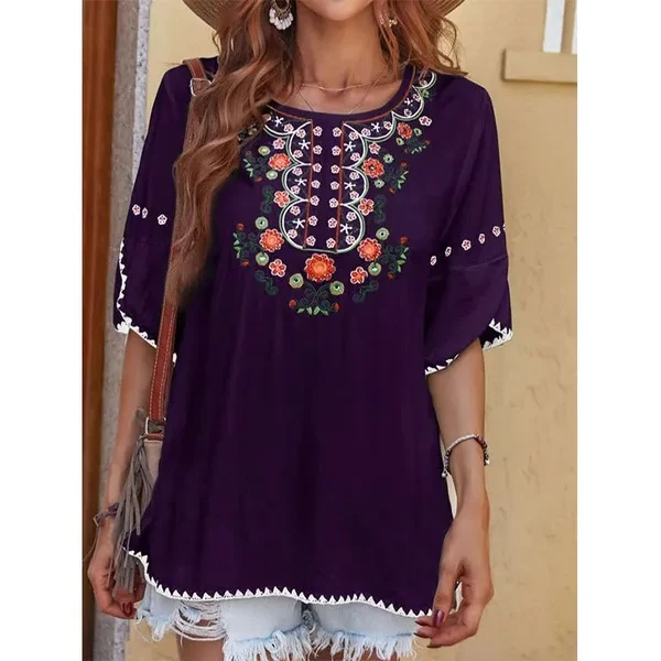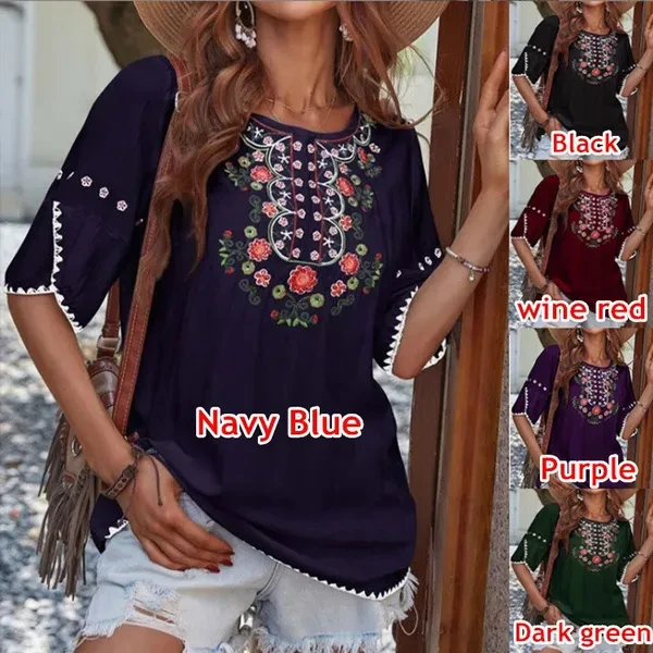 XS-8XL NEW Women's Fashion Summer Clothes Casual O-neck Short Sleeves Tops Ladies Retro Ethnic Style Floral Printed Blouses Loose T-shirts Plus Size Cotton Shirts Bohemian Casual Shirts Half Sleeves O