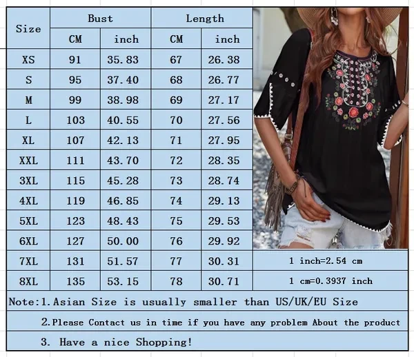Welcome to my shop, We have our own factory, we will provide the lowest price, the best quality and service. Item Type:Tops Gender:Women Collar: O-Neck Pattern: printing Style: Fashion casual,Retro Color: As the picture show Sleeve: Half sleeve Suitable season: Summer, Autumn Size: XS-8XL(1cm=0.394inch) Package included: 1 Blouse Note: 1.Asian Size is usually smaller than US/UK/EU Size, please check the size details carefully to get your fitted size before purchasing, thank you. 2.Colors: As different computers display colors differently, the color of the actual item may vary slightly from the above images 3.Tile physical measurements, 1-2 cm error belongs to the normal range.Thanks for your understanding. 4.Please Contact us in time if you have any problem About the product.We can help you solve most of the troubles,then give you Good service. 5.If you are satisfied with our products,please give us five star to let more people know, please upload a picture of the product for reference of other customers. thanks. Have a nice Shopping! Name of Responsible Person: VAT SPEED SL Address: Calle Antonio Salvador N99.1 eMail:services@vatspeed-eu.com This merchant is committed to only offering products that comply with the General Product Safety Regulation.