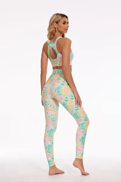 Pattern Description: Inspired by tie-dye art, this pattern seamlessly blends traditional tie-dye with a modern aesthetic. The primary hues are pink, yellow, and green, interwoven together with shades of blue and white, resulting in a vibrant yet harmonious overall palette. The pattern's lines are curved and fluid, forming freely blooming flower shapes, showcasing a rich sense of depth and abstract beauty. The bright and vivid pattern illuminates your everyday workout, making you stand out in the crowd.  Product Features: High-waisted design perfectly shapes, supports and flatters any body types. No small elastic band at the top. Two side pockets for essentials. No side seams for extra flattering fit and comfort. Stretchy and light fabric for a smoothing, second-skin feel. Fabric: Made with 84% RPET and 16% spandex from recycled plastic bottles and it is 100% recyclable! - Four-way stretch, breathable and anti-bacterial.